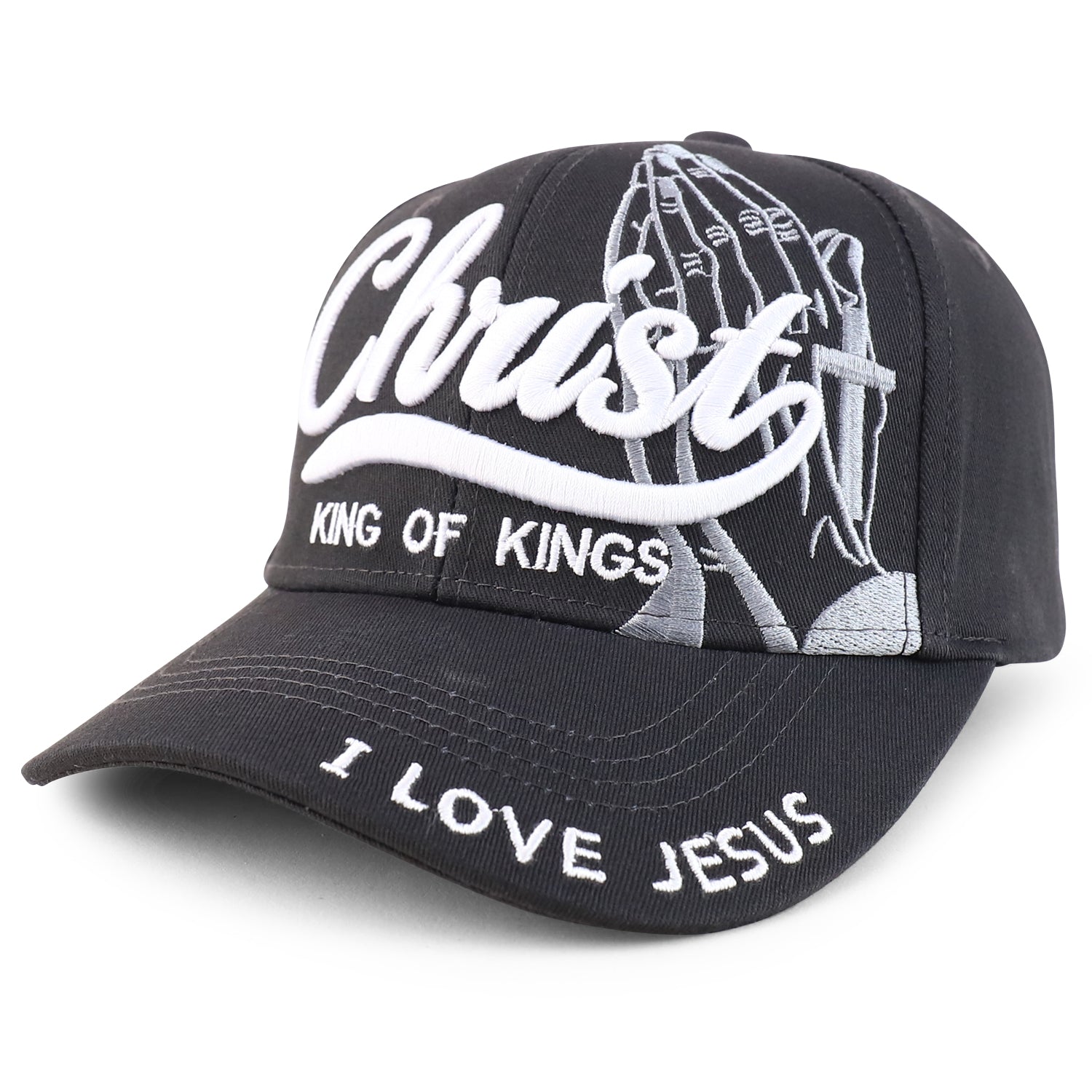 3D Christ King of Kings Embroidered Jesus Christian Ball Cap. 100% Polyester. 3D Christ with King of Kings and image of praying hand is embroidered on the front. 6 panels, mid profile, structured crown. Stiff and pre-curved bill, same color under bill, I LOVE JESUS is embroidered on the side of bill. Finished with an adjustable hook and loop closure, I LOVE JESUS is embroidered on the back strap. One size fits most.