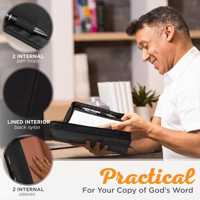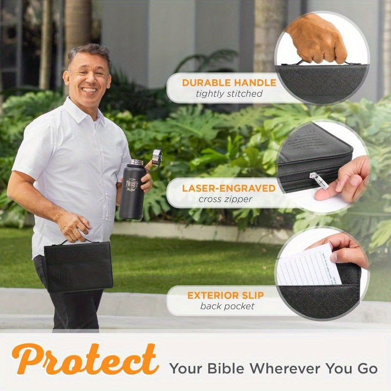 Protect and carry your Bible with confidence in a sleek, durable black faux-leather cover that combines timeless style with everyday practicality.