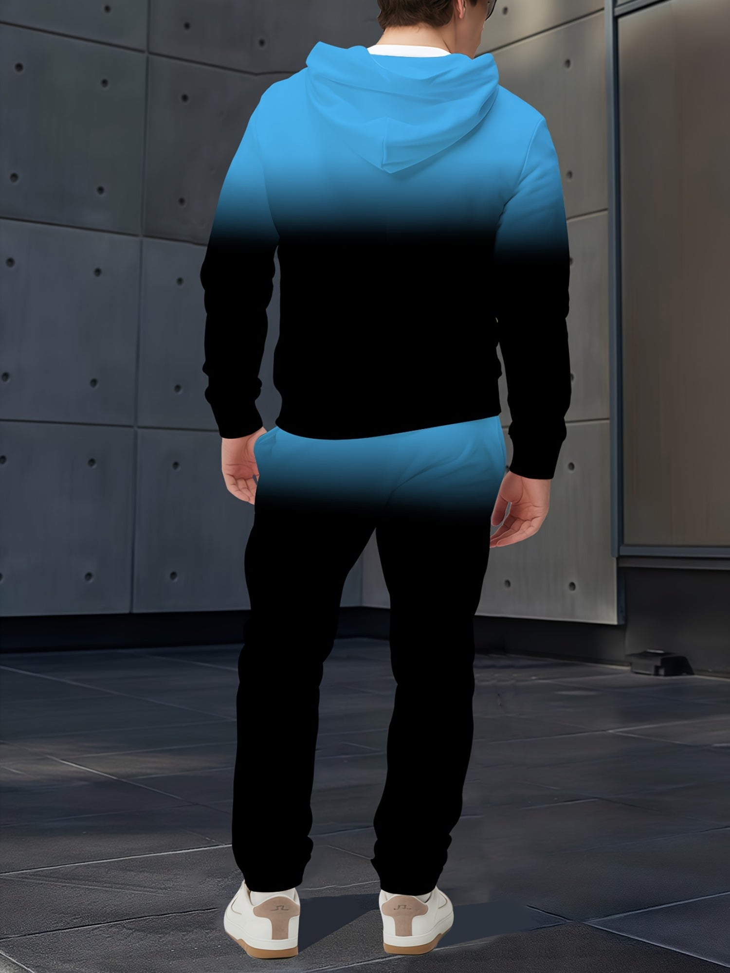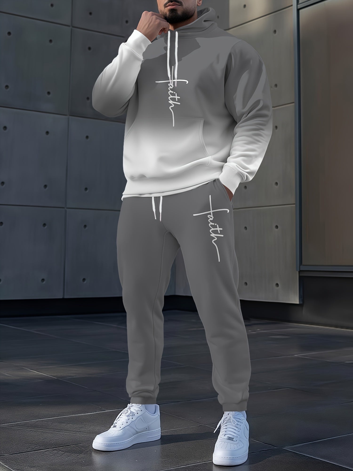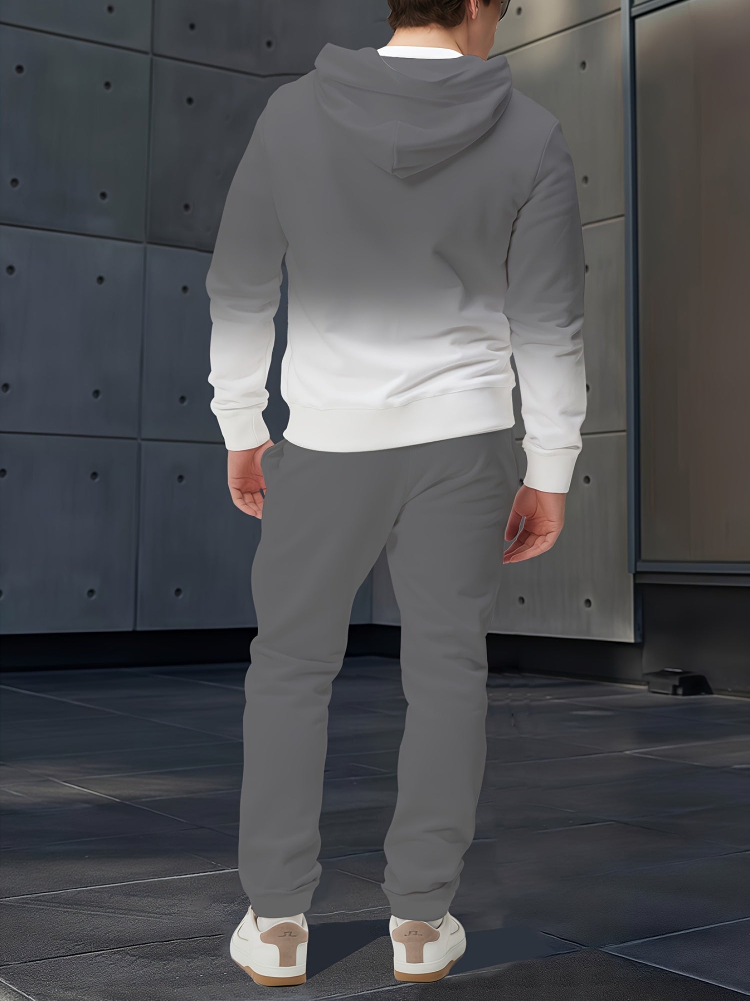 Gray Gradient Full-Body Print Hoodie & Sweatpants Set - Casual Long Sleeve Pullover