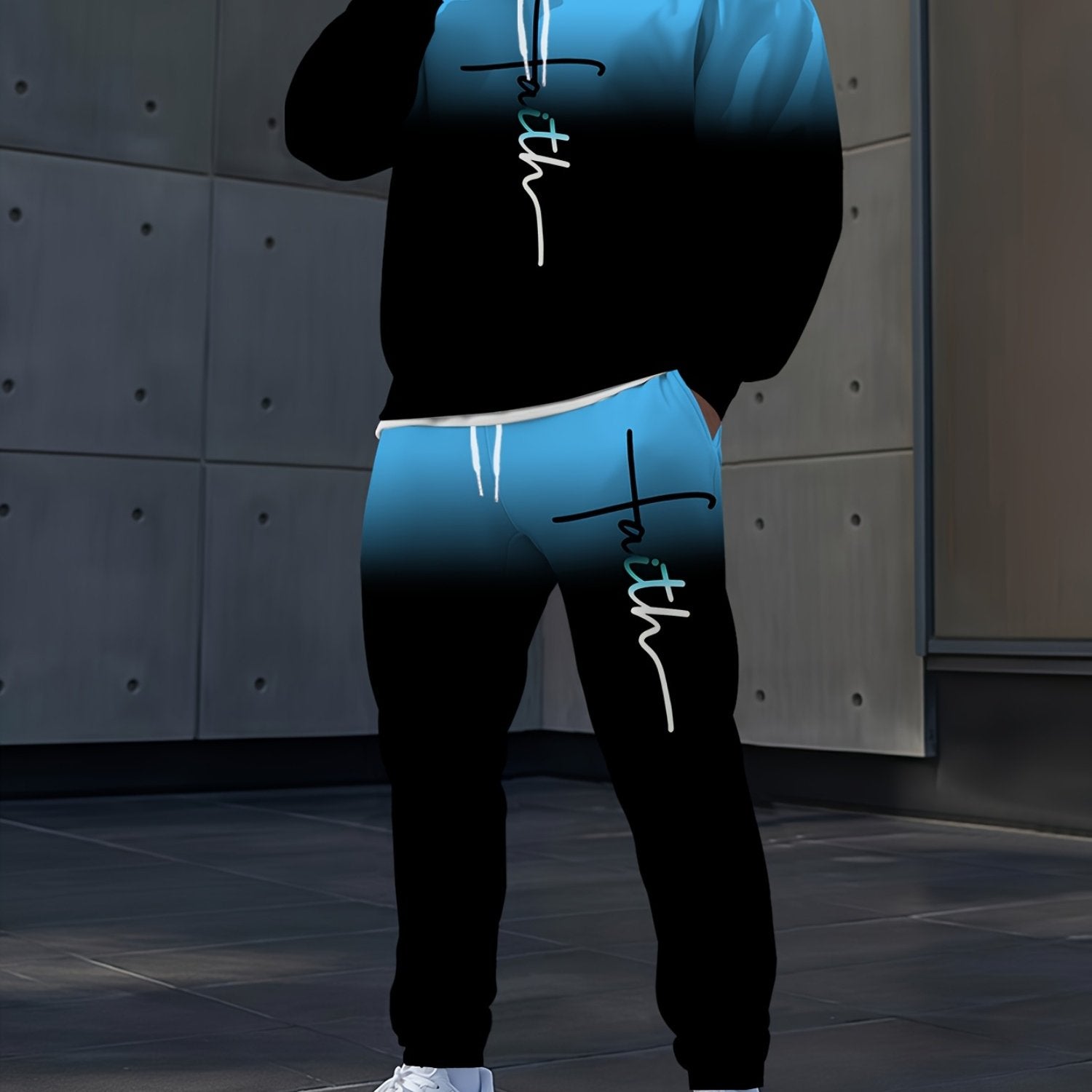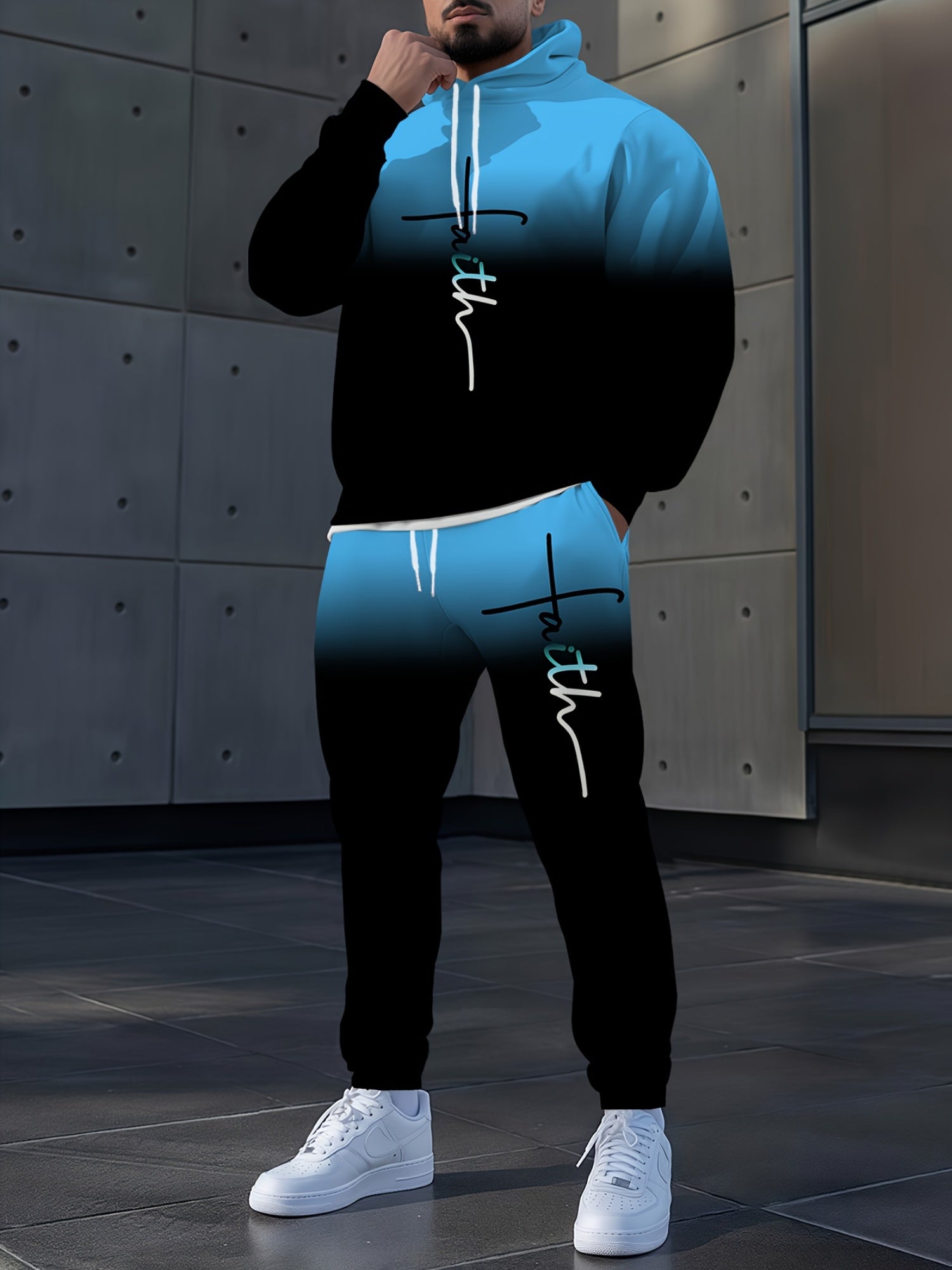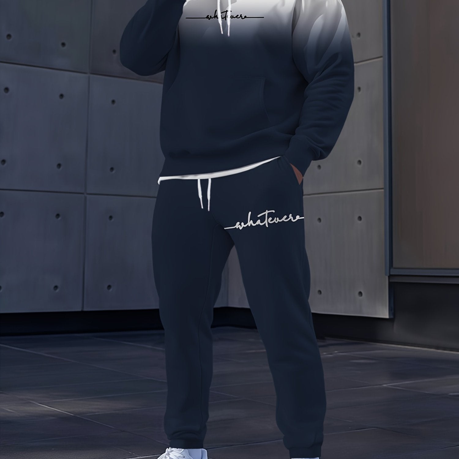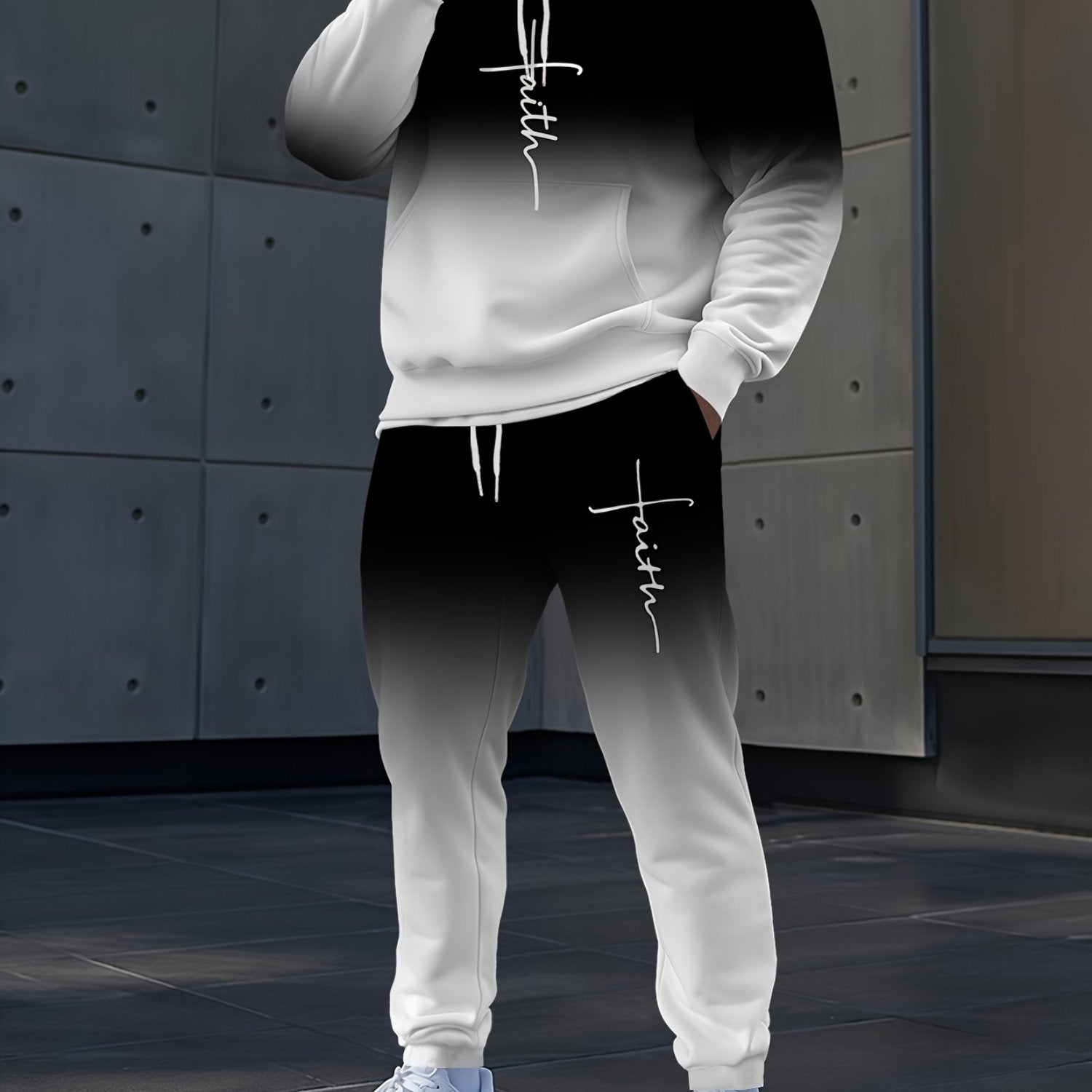 Gray Gradient Full-Body Print Hoodie & Sweatpants Set - Casual Long Sleeve Pullover
