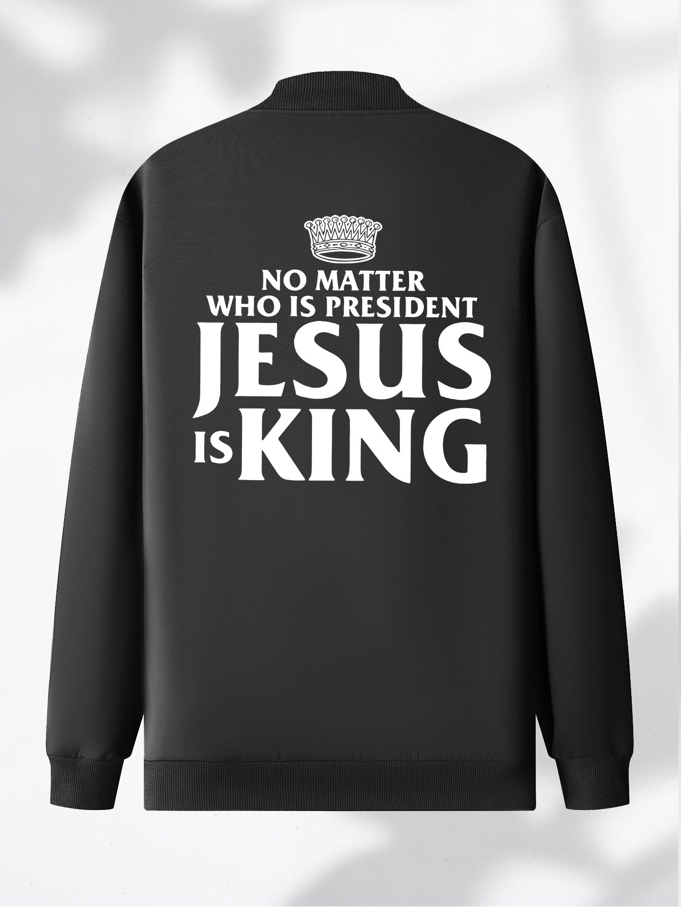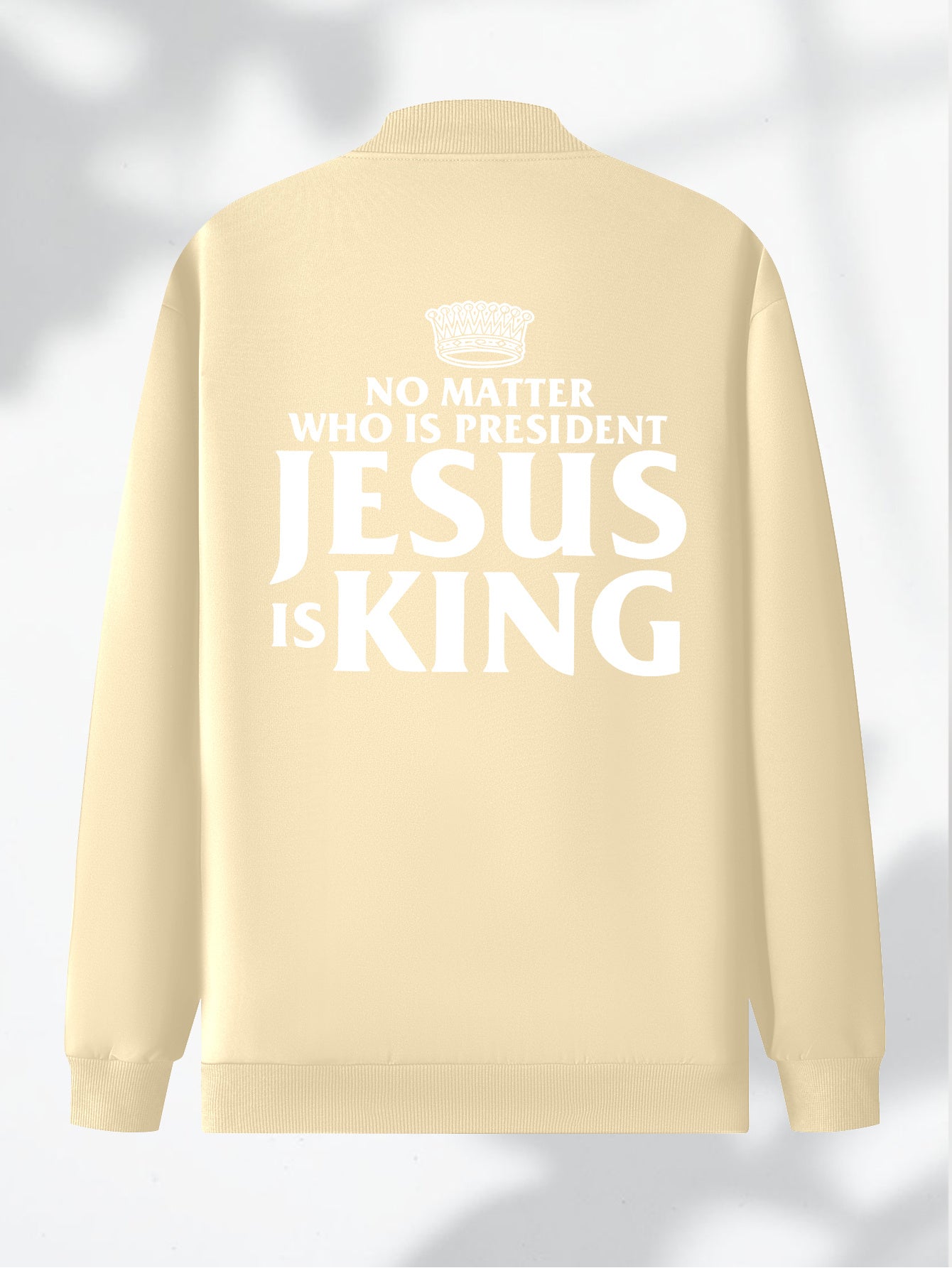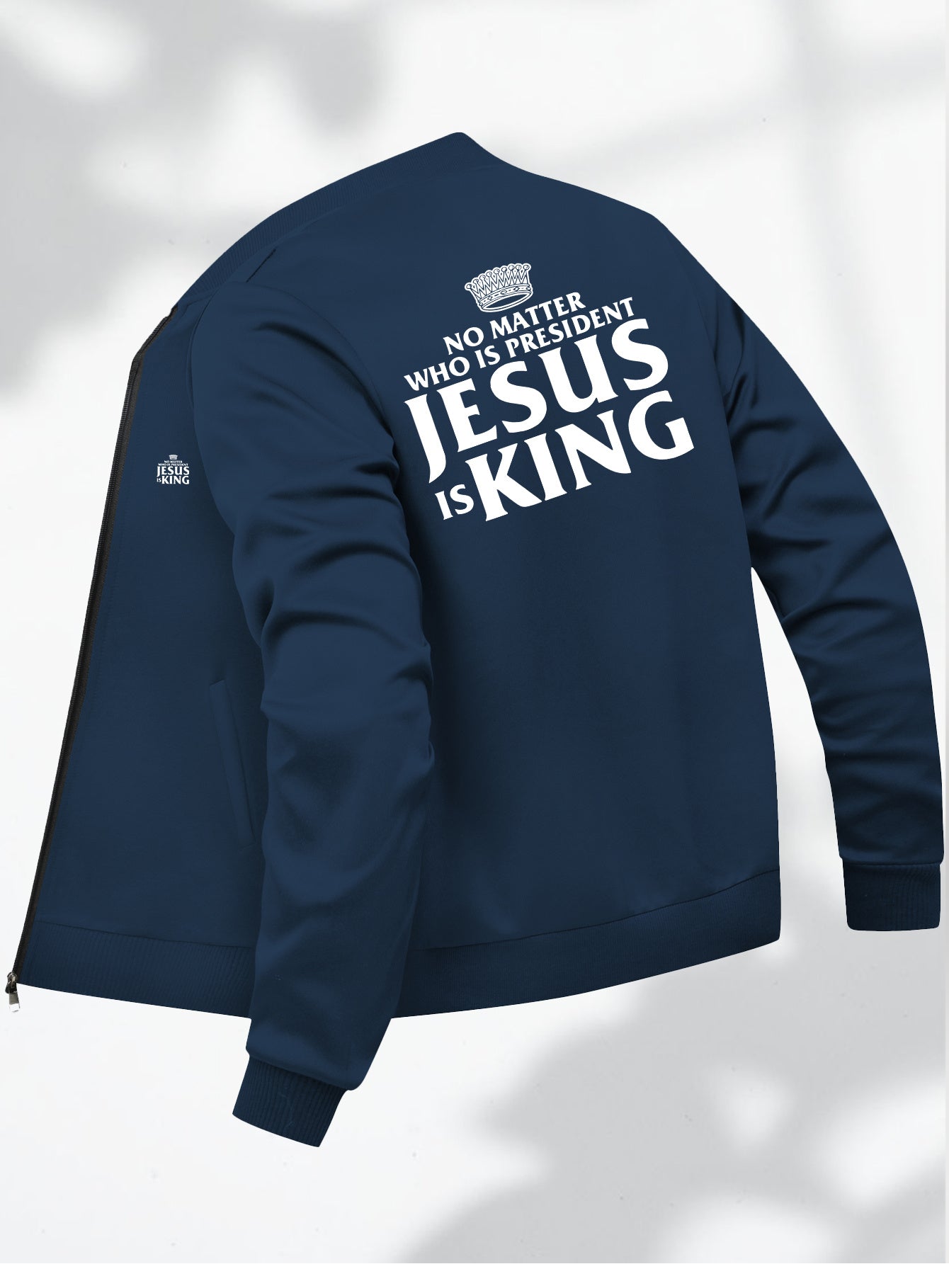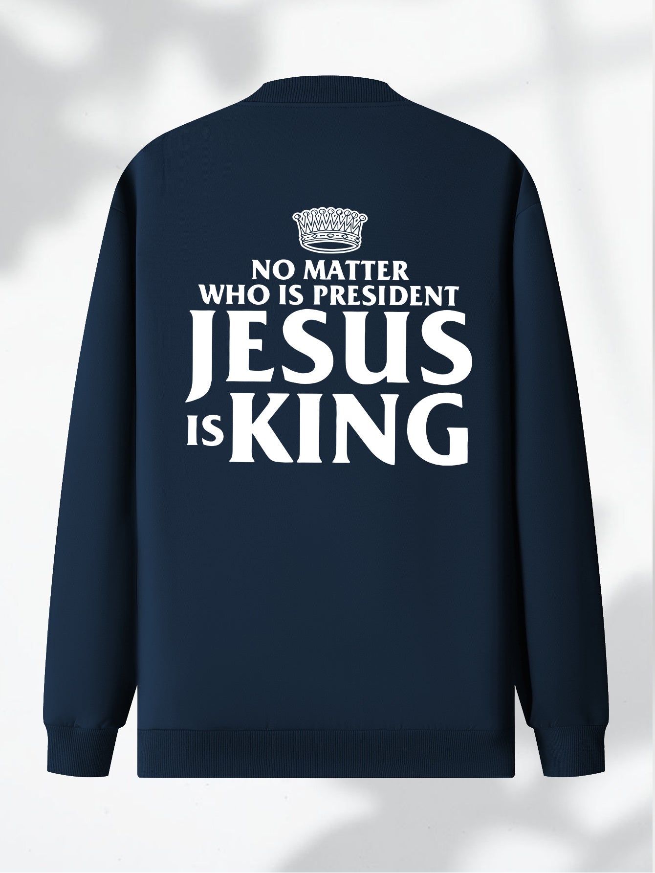 No Matter Who is President, Jesus is King — a bold navy zip-up that lets you wear your faith confidently while staying comfortable every day.