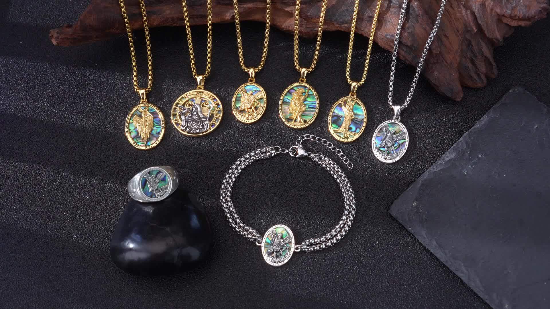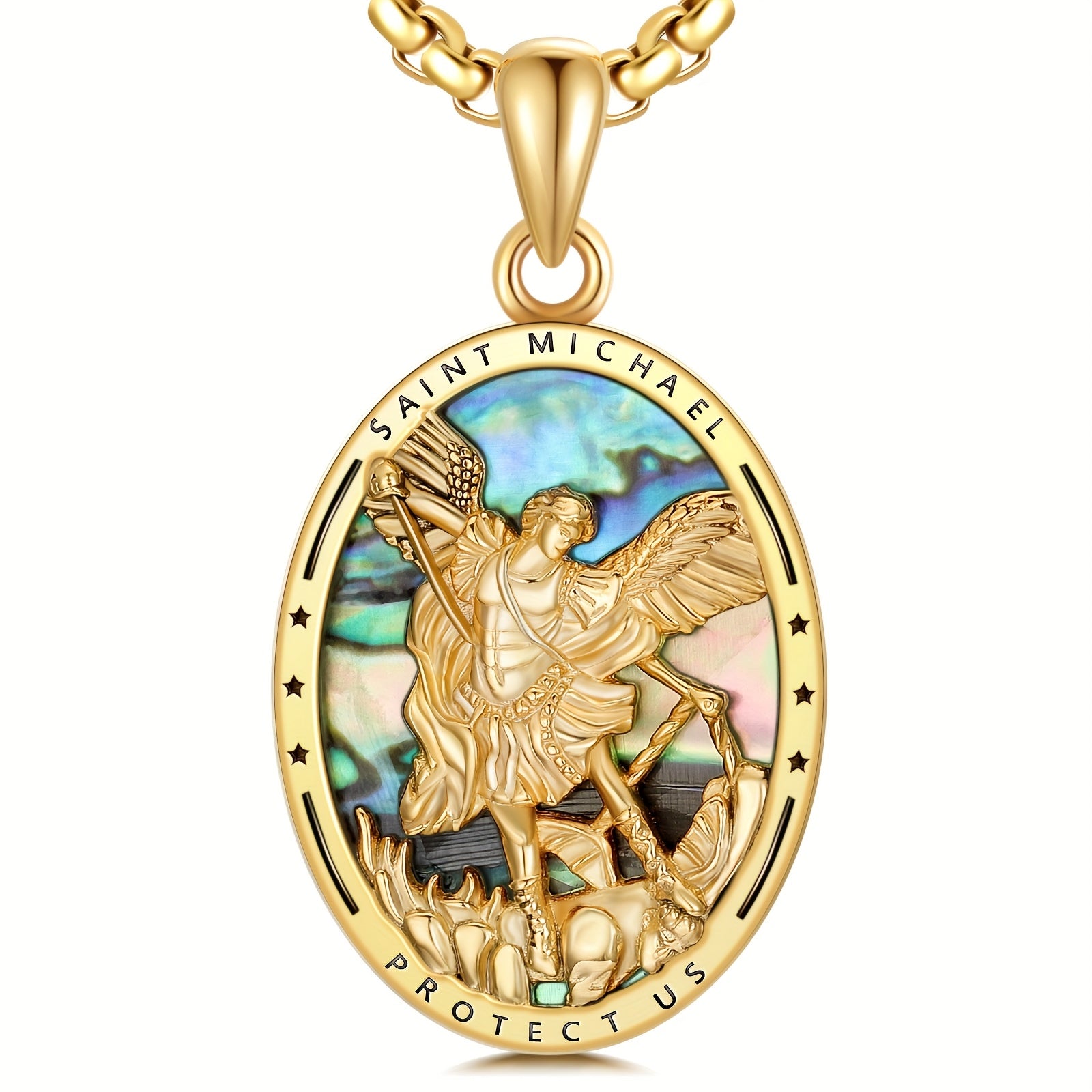 Step into bold elegance with the Archangel Michael Pendant Necklace, a golden abalone mosaic centerpiece set in 925 silver and finished with 18K gold plating for radiant shine.