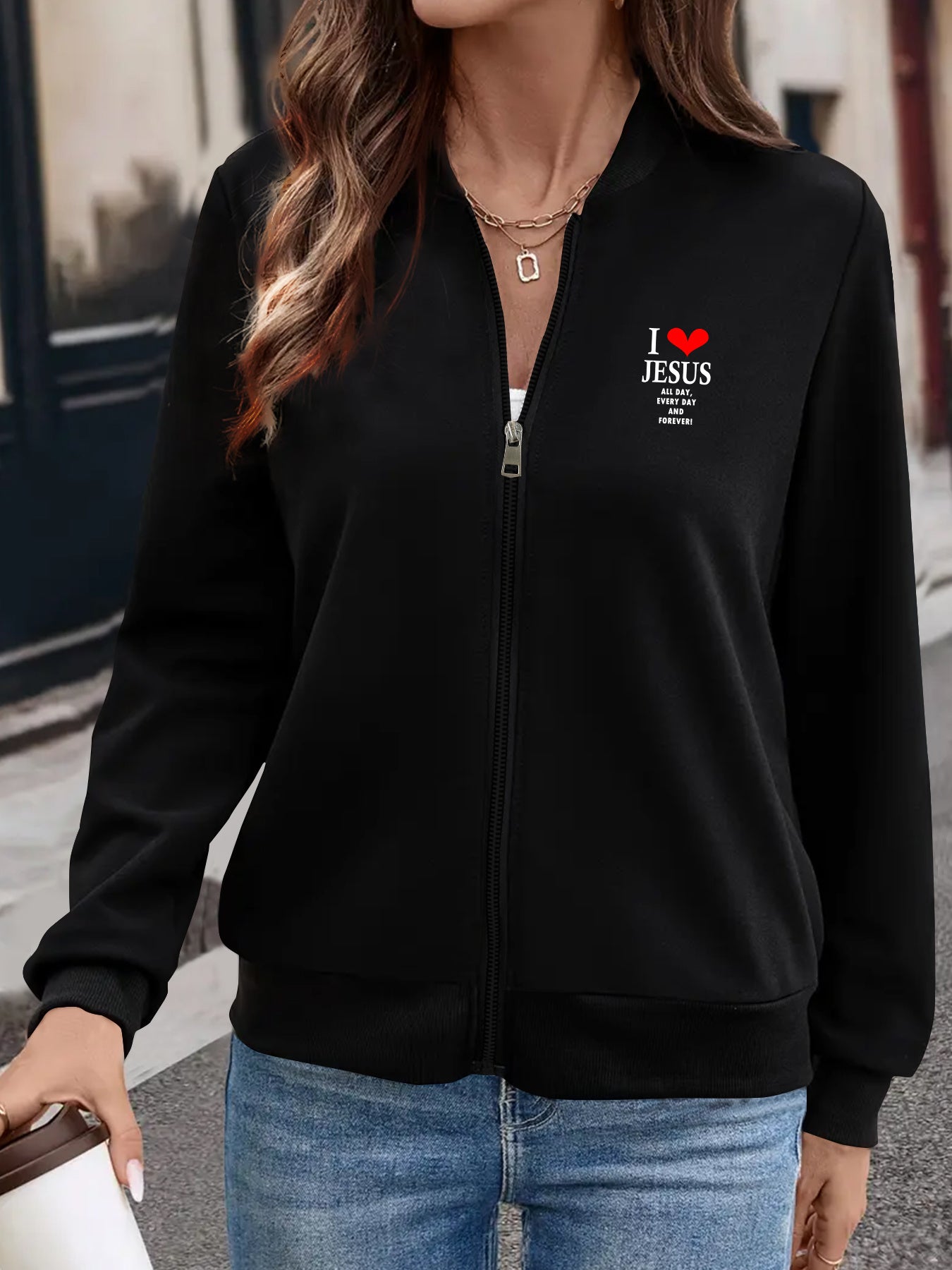 Love Heart Print Bomber Jacket Geometric Pattern Pockets