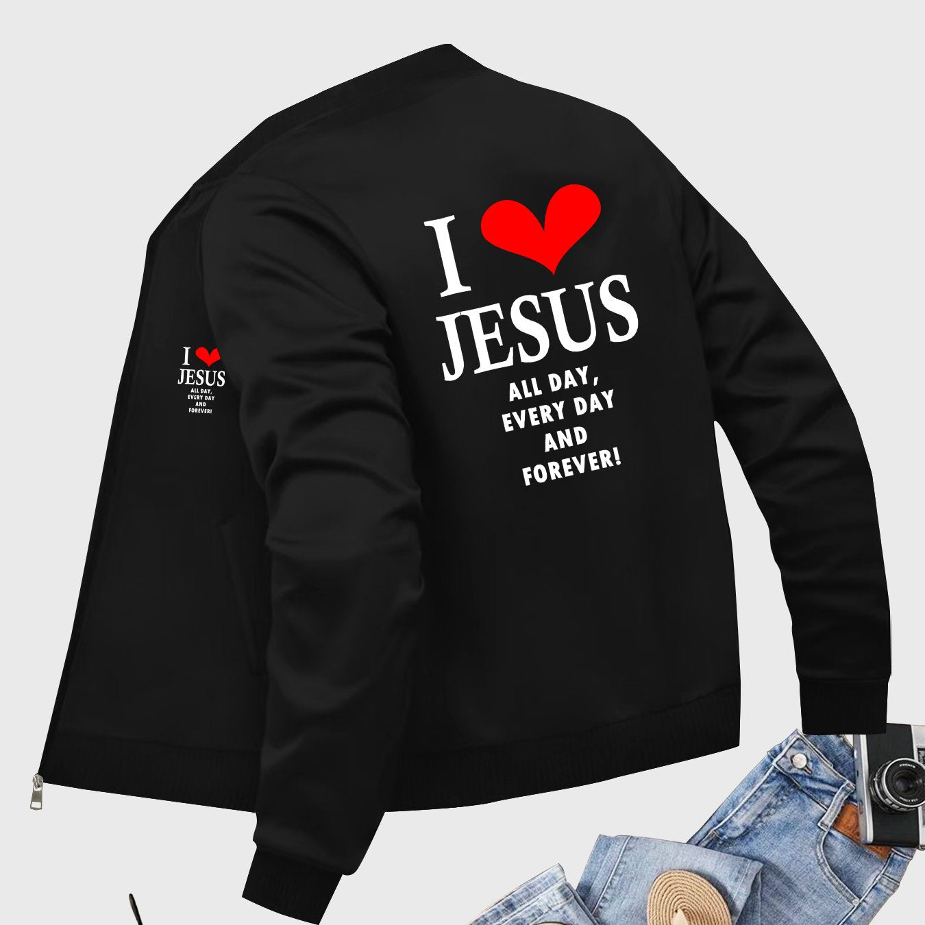 From In His Divine Power, you gain durable style with the Love Heart Print Bomber Jacket, featuring geometric flair and practical pockets.